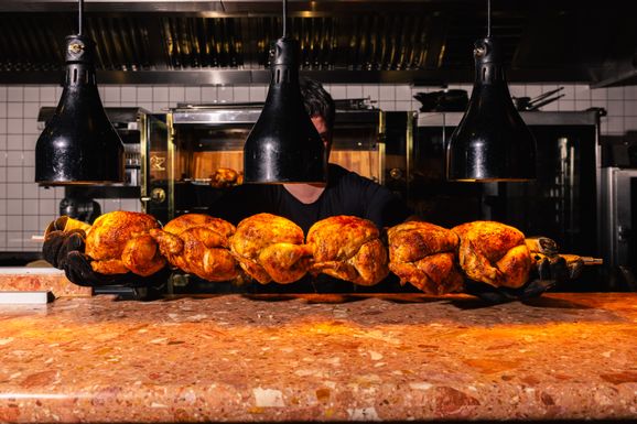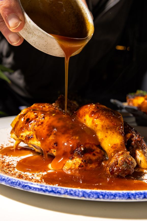 At the centre of the restaurant is Ancoats’ first traditional rotisserie oven, a wall of fire that cooks up to forty eight northern chickens every ninety minutes. Each bird is prepared, seasoned and brined in house before being slowly rotated over open heat. As the birds turn, they self baste, building crisp, golden skin and succulent meat with depth of flavour that comes from time, fire and technique. Finished with house recipe butters and carved fresh, each chicken is served hot, glossy and at its best, straight from the flame.