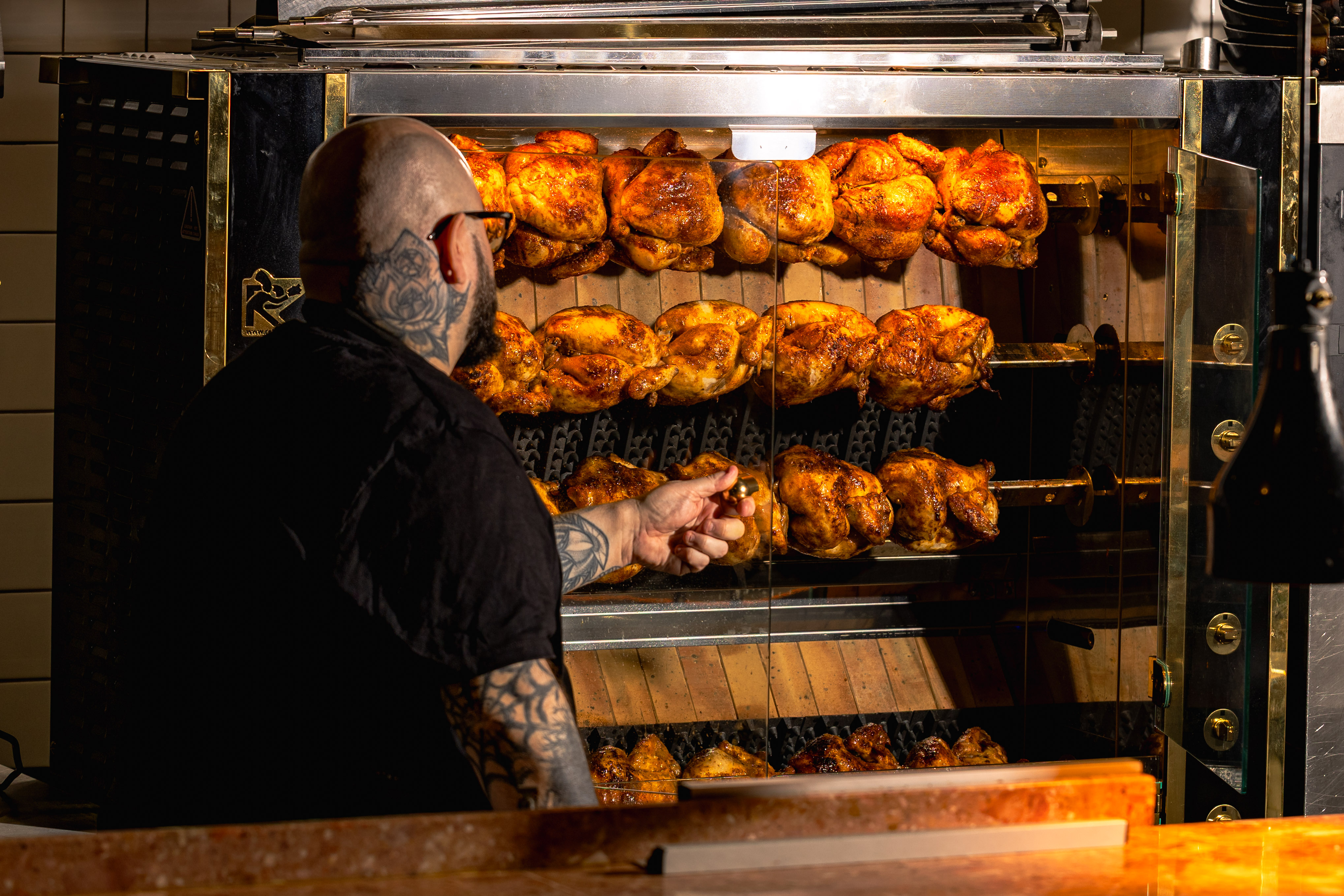 At the centre of the restaurant is Ancoats’ first traditional rotisserie oven, a wall of fire that cooks up to forty eight northern chickens every ninety minutes. Each bird is prepared, seasoned and brined in house before being slowly rotated over open heat. As the birds turn, they self baste, building crisp, golden skin and succulent meat with depth of flavour that comes from time, fire and technique. Finished with house recipe butters and carved fresh, each chicken is served hot, glossy and at its best, straight from the flame.