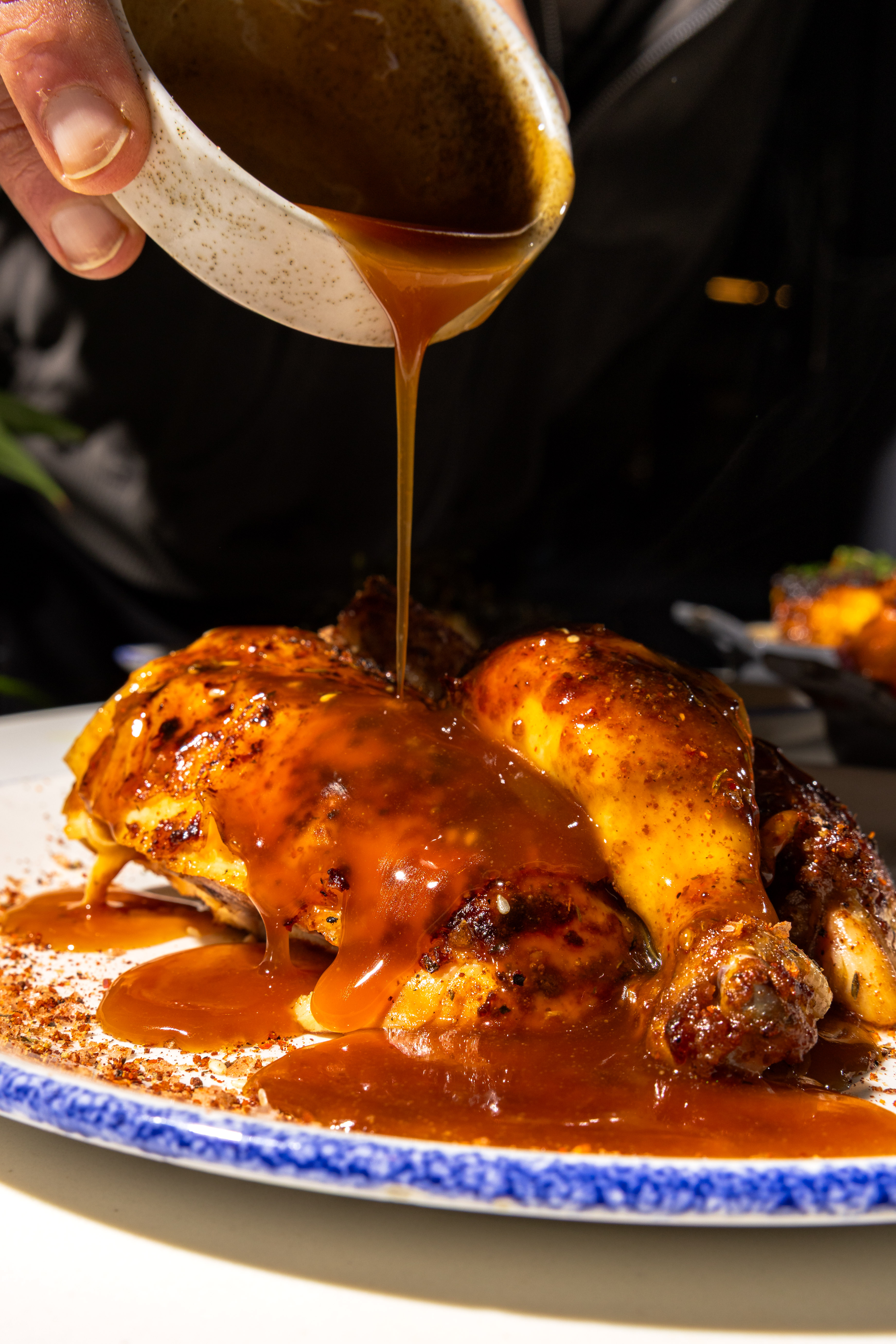 Chicken is cooked in carefully timed batches throughout the day, allowing each bird to be served at its peak, finished with butter and carved fresh to order. Chicken is available quarter, half or whole, paired with a tight selection of sides designed to complement the richness of fire cooked flavour, including rotisserie potatoes, tallow fries and salt baked sweet potato, alongside lighter salads and vegetable led dishes for balance.